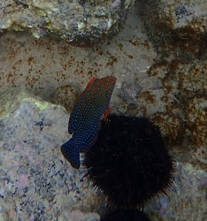 It was a cool day with sprinkles of rain and there was only one other person on the small beach as I got in. The water was actually only moderately cloudy and I rued the absence of the camera. Right away I saw the blacklip butterfly, but didn't see anything else of interest as I swam out to in front of the palace.